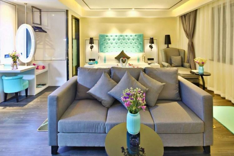 这是一家时尚、轻奢、跨界的精品酒店,也是一家有调性、有情怀的酒店。整体装修融合了香奈儿、蒂芙尼元素的欧式设计风格,主体以白色、黑色、蒂芙尼蓝为主色调。